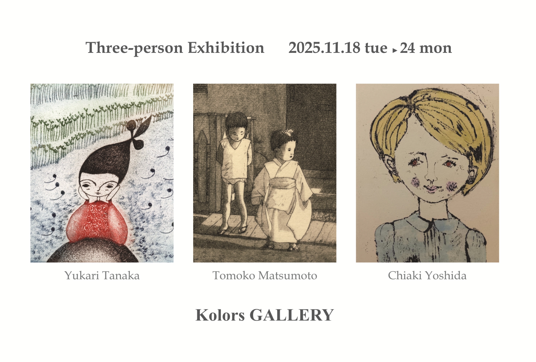 銅版画工房アトリエ凹凸で出会った田中ゆかり・松本智子・吉田千秋の三人展です。